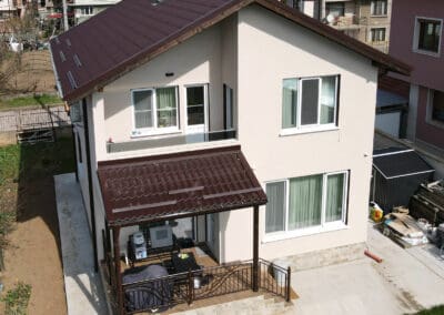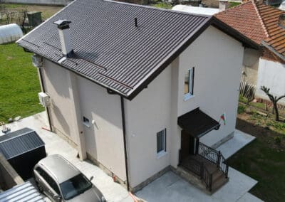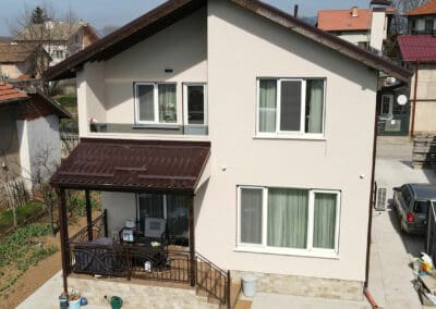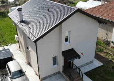 Къщата впечатлява със своя модерен екстериор, който съчетава светли тонове и елегантни тъмни покривни материали. Покривът е двускатен и е изпълнен с профилирани ламаринени листове в кафяв цвят, което придава елегантен и съвременен вид на сградата. Изчистените линии и просторните прозорци осигуряват обилно количество естествена светлина и създават усещане за простор и комфорт. Пред входа на къщата има малко стълбище и чардаци, подходящи за релаксация и социални събирания.