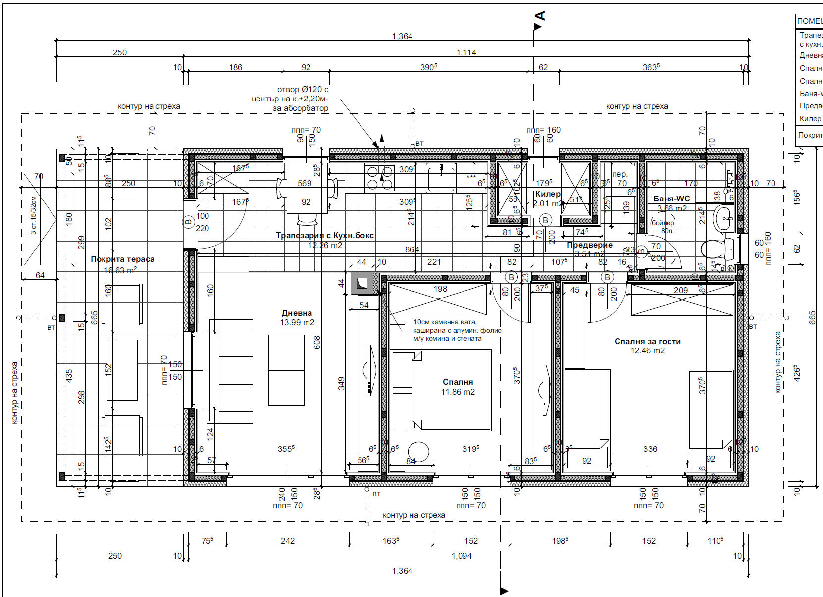 Конструкцията е изцяло дървена, с висок клас изолация от каменна вата Rockwool, която осигурява отлична топло- и шумоизолация. Фасадата е завършена с декоративна каменна облицовка в основата и минерална мазилка в светъл тон. Покривът е четирискатен с керемиди, което придава класически и уютен вид.